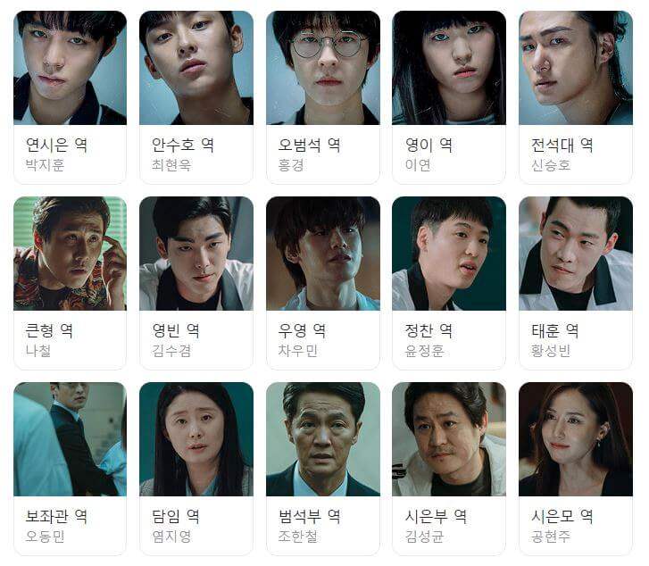 웹드라마 약한영웅 Class 1은 워너원 출신의 배우 박지훈(연시은 역)과 장기용과 닮은꼴 배우인 최현욱(안수호 역), 두 배우가 주연으로 출연하며 총 15명의 배우들이 등장인물로 출연하고 있습니다.