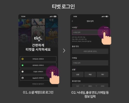 '티벗'으로 아침마당 돌발퀴즈에 참여하기 위해서는 우선 로그인을 먼저 진행하여야 합니다. 왼쪽 그림과 같은 화면에서 카카오톡, 네이버, 구글, 애플 중 한 가지 소셜계정을 선택한 뒤 닉네임과 출생연도, 성별, 연락처, 관심사 등의 정보를 간단히 입력하면 로그인이 완료됩니다.