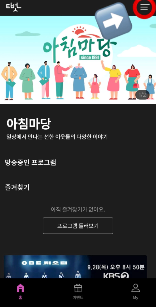 2023년 9월 4일에 리뉴얼된 애플리케이션이 오픈하여 아직은 다소 부족한 느낌이지만 차츰 더 많은 기능과 편리함을 가지게 될 것으로 기대가 됩니다. 참고로 아침마당 방송 중 진행되는 이벤트는 ARS를 제외하고는 바로 이 '티벗'에서만 참여가 가능하다는 점 기억해 두시기 바랍니다.