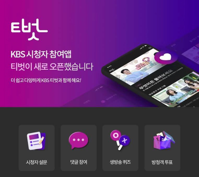 KBS '티벗' 이란 KBS에서 '아침마당', '무엇이든 물어보세요' 등 현재 방영되는 방송을 직접 참여할 수 있는 애플리케이션입니다. 주로 시청자 설문, 댓글참여, 생방송 퀴즈, 방청객 투표 등에 참여할 수 있습니다. 현재는 위의 대표적인 두 개 방송에 참여할 수 있지만 추후에는 '티벗'을 통해 트롯이나 가요 등의 음악경연 프로그램의 투표 참여 등도 쉽고 편하게 참여할 수 있지 않을까 생각됩니다.
