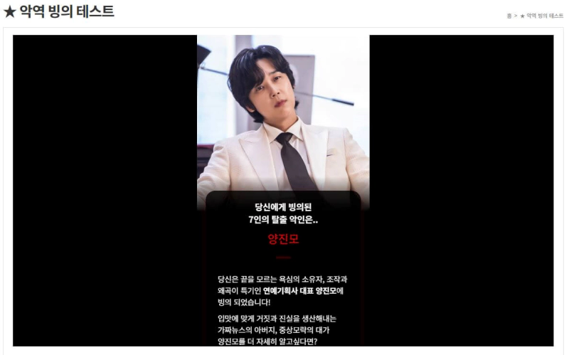 참고로 필자는 테스트 결과 극 중 연예기획사 대표 양진모에 당첨되었습니다. 상당히 흥미로웠습니다.